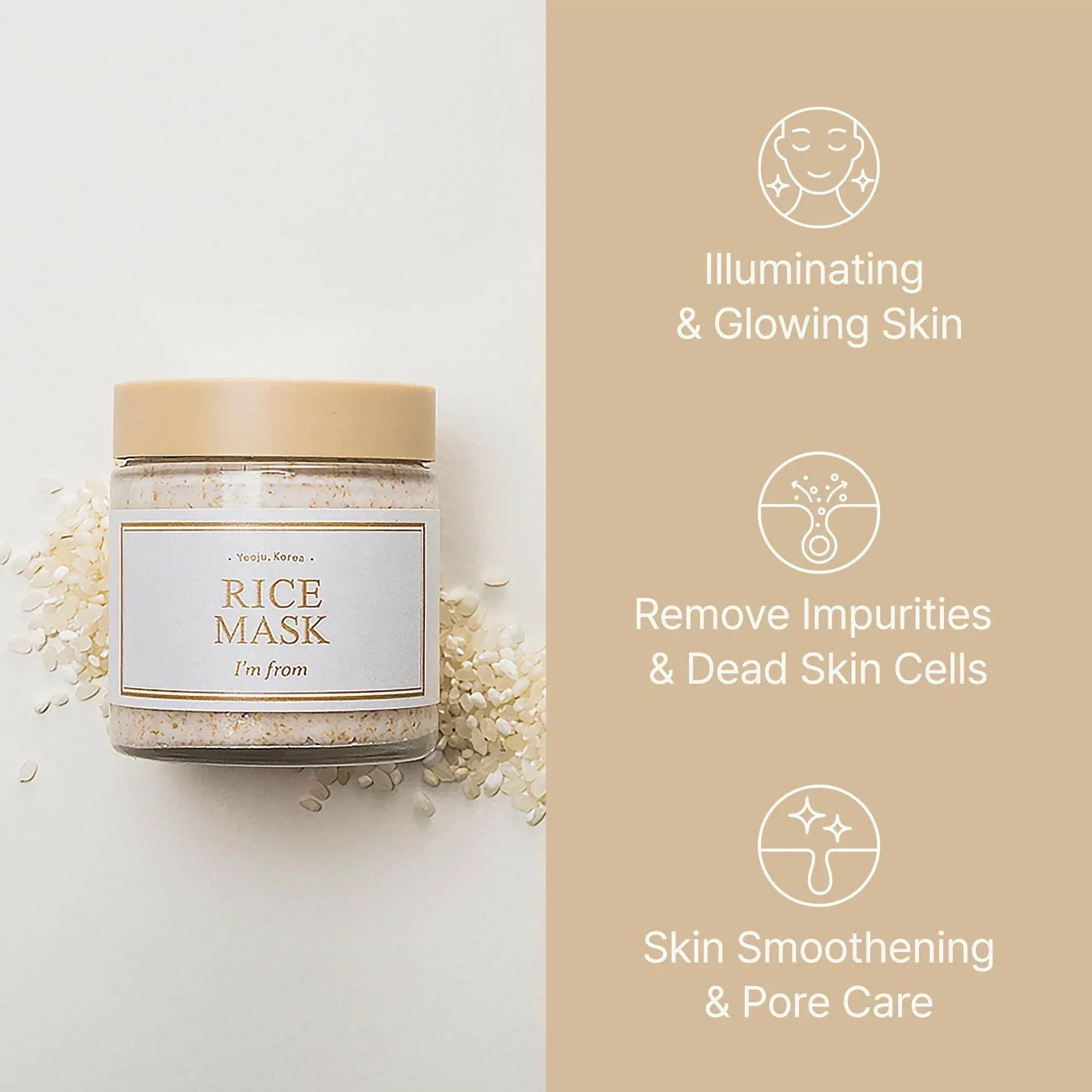 I'm from Rice Mask is a gentle exfoliating wash-off mask enriched with rice and rice bran extract to brighten and smooth the skin. This creamy mask helps to remove dead skin cells and impurities while delivering hydration, leaving your skin soft, radiant, and refreshed. The natural rice grains gently exfoliate without irritation, making it suitable for all skin types, including sensitive skin.